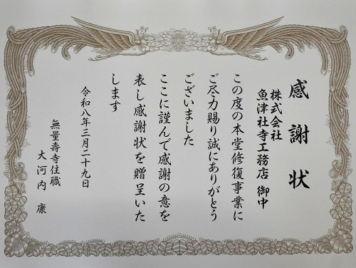 | ・リポート: | 工事が完了した本堂で、感謝状授与式が行なわれました。
