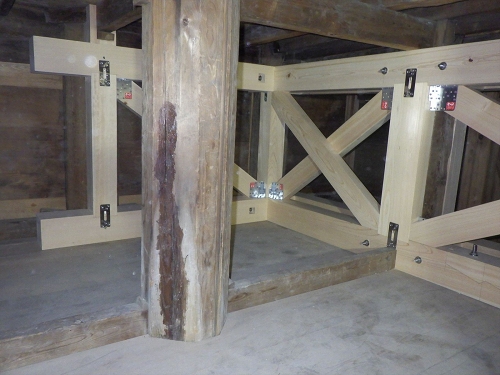 現場では、小屋組の補強と野地板の復旧が完了しています。