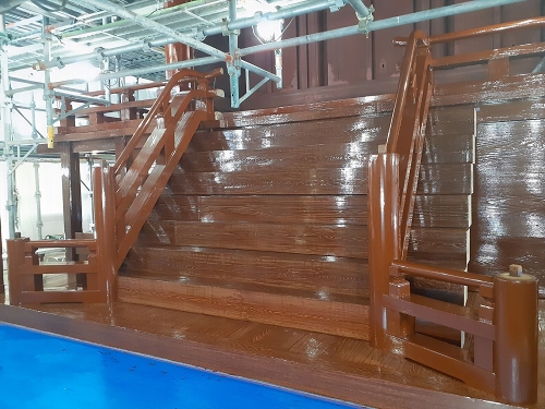 塗装工事では、縁より下の弁柄朱漆(べんがらしゅうるし)の中塗り・上塗りを行なっています。