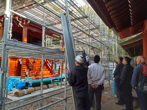 (1)素屋根・足場に覆われた本殿(手前は祭文殿) |