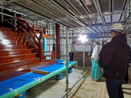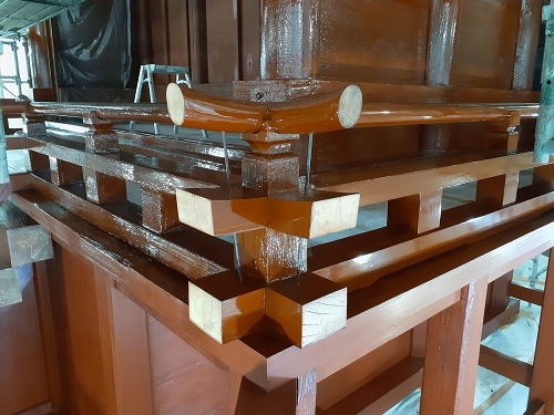 工事は9月中旬に床下の補強が完了し、現在は縁より下の弁柄朱漆(べんがらしゅうるし)の中塗りを行なっています。