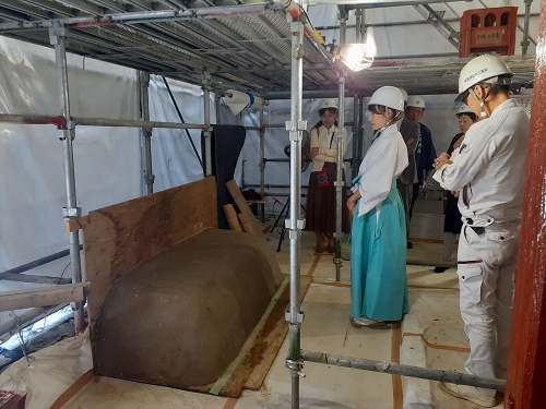 補強完了後は、屋根の檜皮葺を開始する予定です。