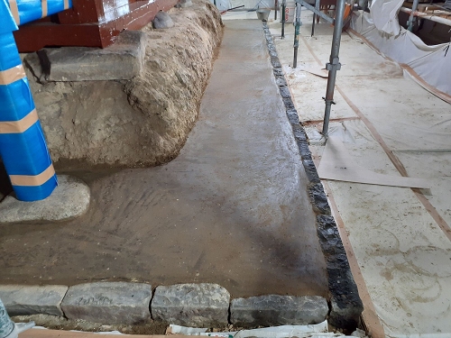 現在は左官工事の土間と亀腹(かめばら)の三和土(たたき)の修理を行なっています。